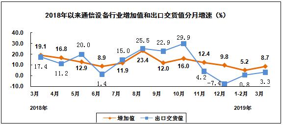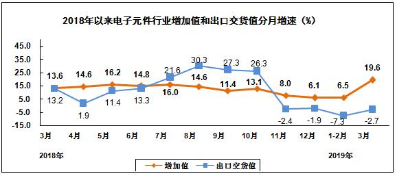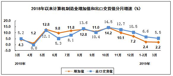 2019年一季度,规模以上电子信息制造业增加值同比增长7.8%,增速同比回落4.7个百分点;出口交货值同比增长2.9%,增速同比回落6.7个百分点。其中,3月份规模以上电子信息制造业增加值同比增长10.2%,出口交货值同比增长3.2%。