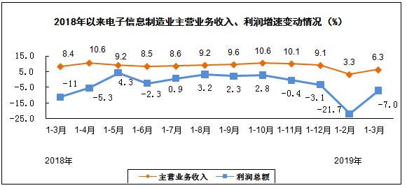 一季度,规模以上电子信息制造业营业收入同比增长6.3%,利润总额同比下降7.0%,营业收入利润率为2.85%,营业成本同比增长6.2%;3月末,全行业应收票据及应收账款同比增长10.0%。