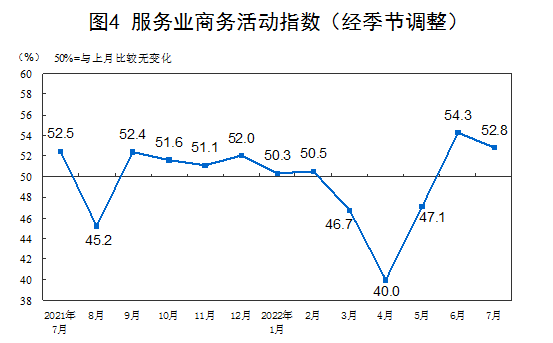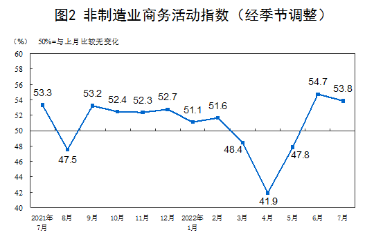 7月份,非制造业商务活动指数为53.8%,比上月下降0.9个百分点,仍位于扩张区间,非制造业连续两个月恢复性增长。