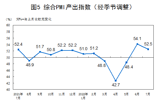 7月份,综合PMI产出指数为52.5%,比上月下降1.6个百分点,仍高于临界点,表明我国企业生产经营总体继续恢复性扩张。