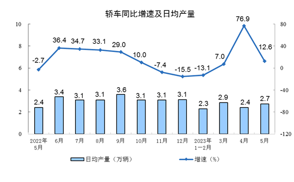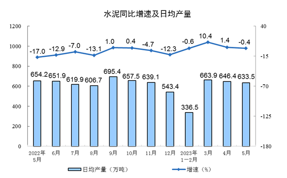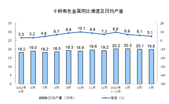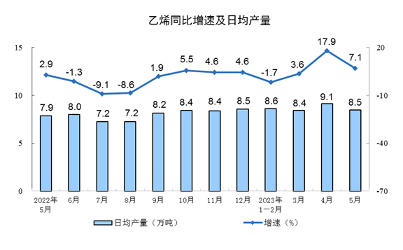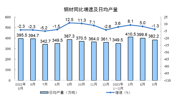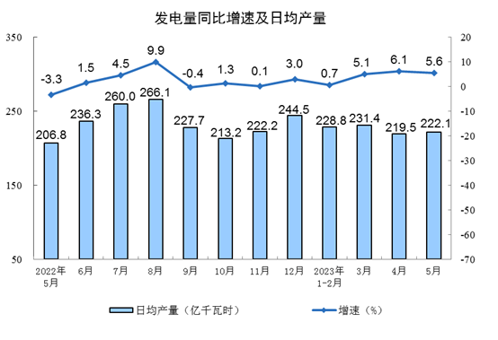 分产品看,5月份,620种产品中有339种产品产量同比增长。其中,钢材11847万吨,同比下降1.3%;水泥19638万吨,下降0.4%;十种有色金属615万吨,增长5.1%;乙烯262万吨,增长7.1%;汽车230.7万辆,增长17.3%,其中新能源汽车67.5万辆,增长43.6%;发电量6886亿千瓦时,同比增长5.6%;原油加工量6200万吨,同比增长15.4%。